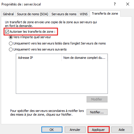 - Aller dans l’onglet Transfert de zone puis cocher Autoriser les transferts de zone :