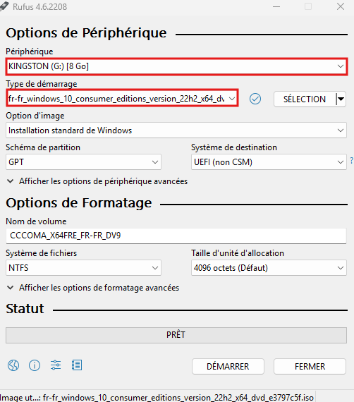 - Démarrer Rufus puis sélectionner l’ISO et la clé USB qui servira de clé bootable. Puis démarrer.