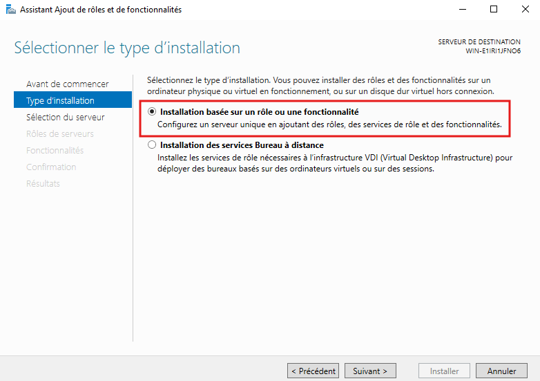 - En type d'installation nous allons choisir Installation basée sur un rôle ou une fonctionnalité puis cliquer sur Suivant :