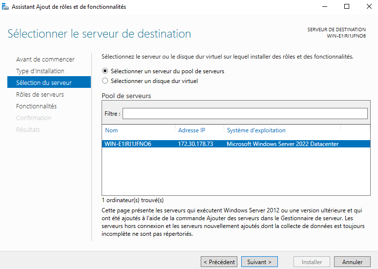 - Choisissons ensuite le nom du serveur dans le pool de serveur. Puis le rôle Serveur DNS :
