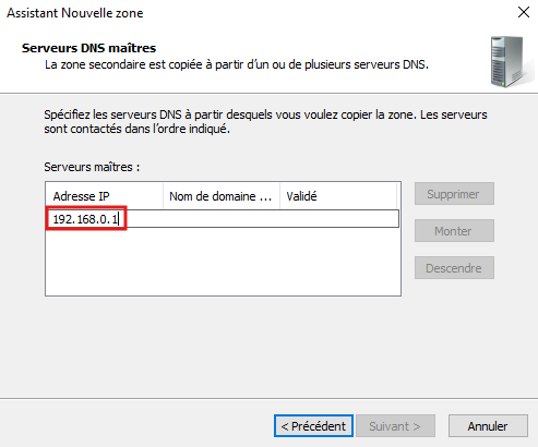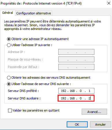 - Dans Serveur DNS Auxiliaire inscrivez l’adresse IP de notre serveur DNS esclave :
