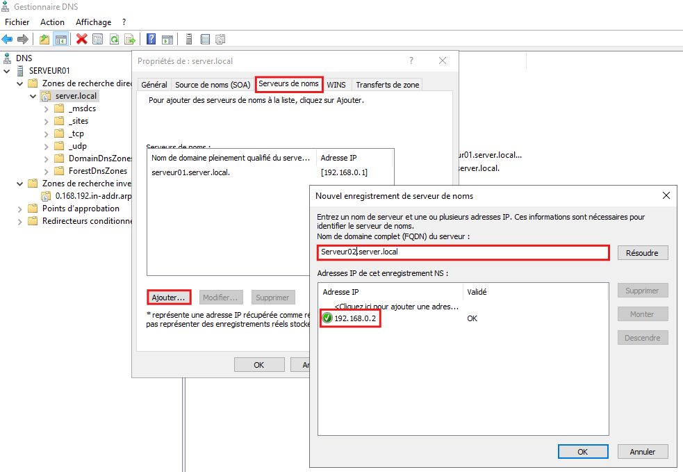 - Onglet Serveurs de noms puis ajouter. renseigner le FQDN du second serveur ainsi que son adresse IP.