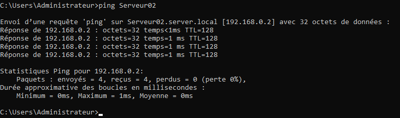 - Ouvrir ensuite une invite de commande et faire un ping sur le second serveur :