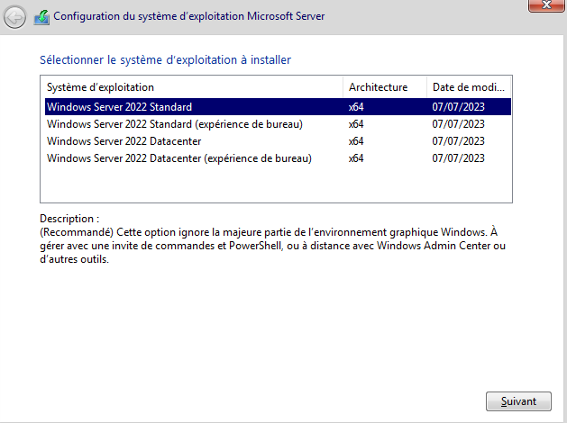 Choisir la version souhaitée de Windows server 2022 :