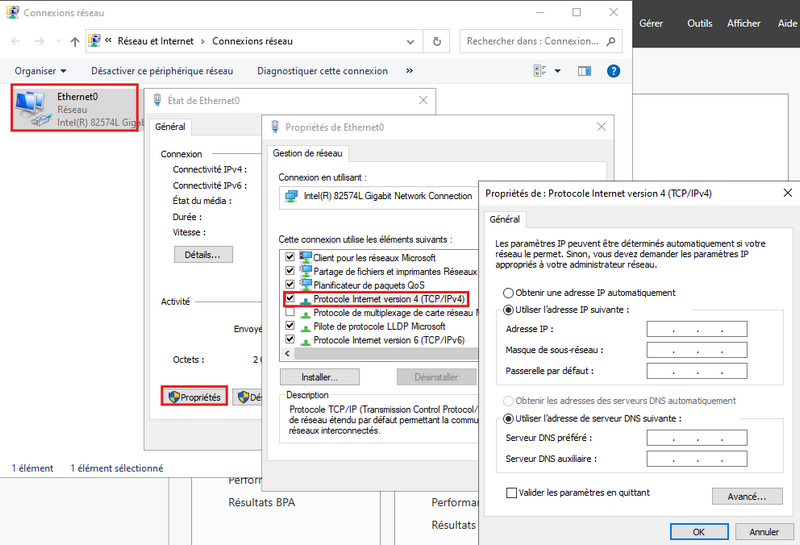 Choisir la carte réseau de l’interface correspondant > Propriétés > Protocole IPv4 puis indiquer l’adresse IP souhaitée, son masque et sa passerelle. Vous pouvez également indiquer l’adresse IP du ou des serveurs DNS